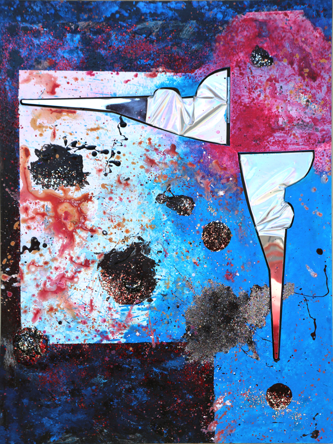 oil, spray, acrylic on board and retro-reflective vinyl, plastic
